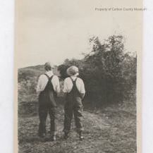 Black & white snapshot print of two women with their backs turned toward the camera walking toward a big bush. They are wearing hats and coveralls.