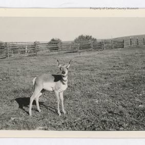 Black & white snapshot. Image shows a baby antelope standing in a grassy area. In the background there is a wooden fence surrounding it. Also there are trees & small bushes.