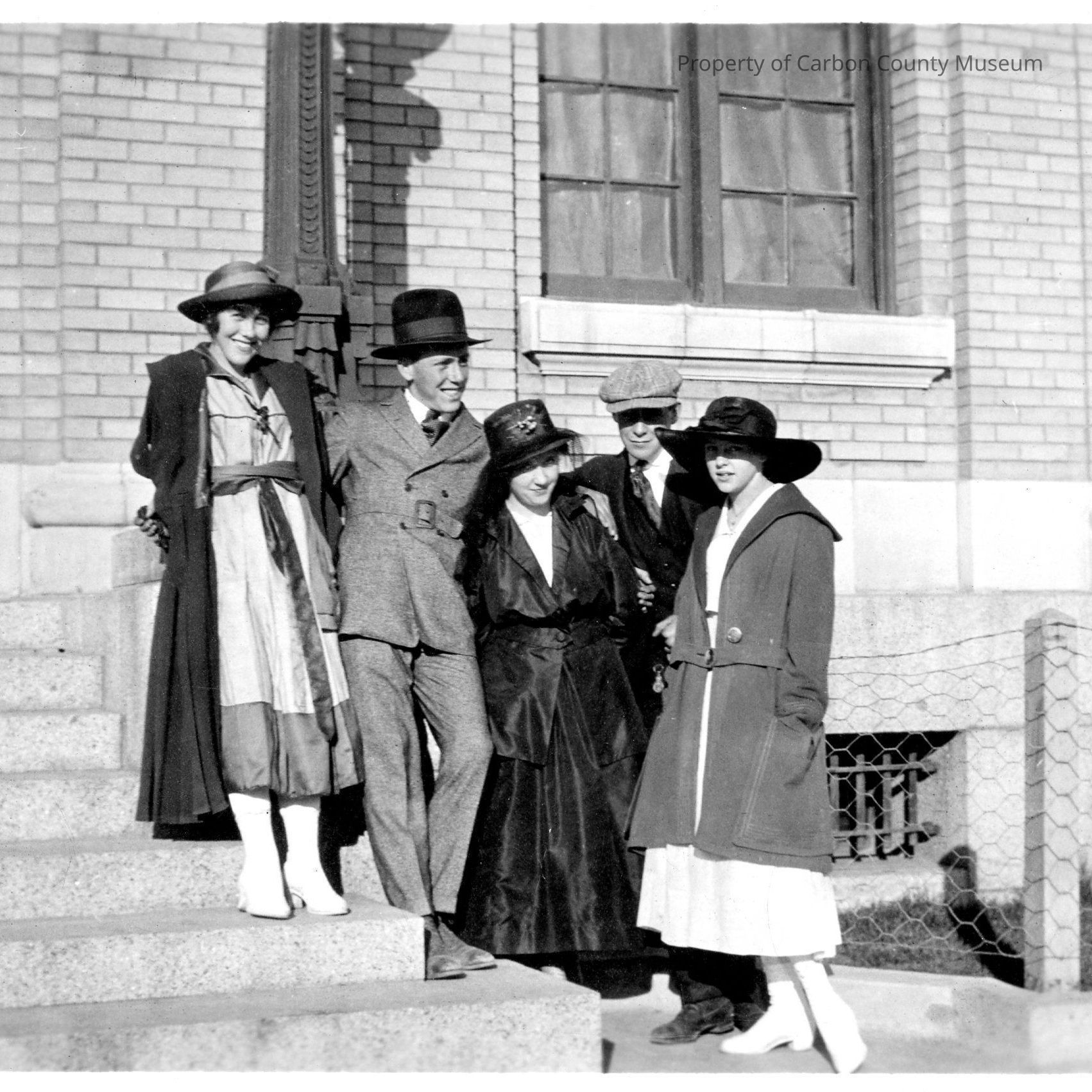 Print 6: Image shows a group of five. Two boys & three girls. Both boys are wearing suit & hats. All three girls are wearing dresses, jackets & hats. One of the boys has his arms around two of the girls. They are all standing on steps outside of a brick building. There is a wire fence behind them.