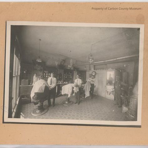 Written on back in blue ink: "1st chair Barber Harvey Childs. 3rd [chair barber] Tom Parks."