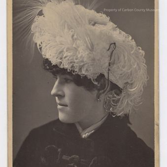 Black & white studio portrait on light brown mat. Image shows a woman looking to her left. She is wearing a dark jacket & a white feathered hat. Background is grey colored.