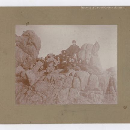 Black & white print on gold mat. Image shows a group of seven people, three men & four women. all are sitting on top of big boulders. All women are wearing dresses & hats. All men are wearing suits & two of them are wearing hats. Not much in the background.