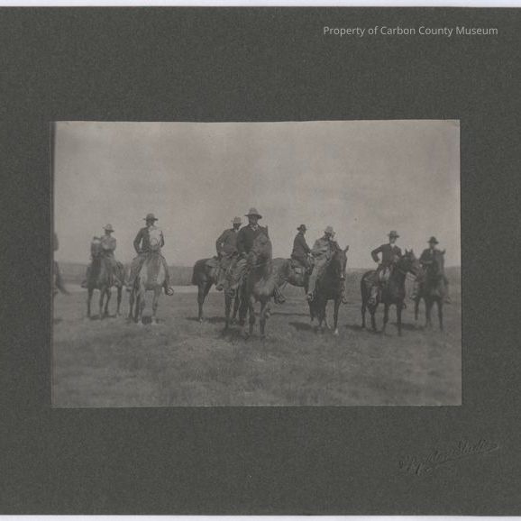 Update - January 2010: Black & white print. Snapshot. Mounted on dark grey matboard. Image of 8 men on horseback gathered on a grassy field. Man at center front is Theodore (Teddy) Roosevelt. Men are all dressed in suits & ties.