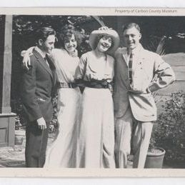 Black & white snapshot. Image shows a group of four people with arms around each other. Two men & two women. Both women are wearing long white dresses & one of the women is wearing a hat. Both men are wearing suits & ties. In the background is part of a porch to the house. There are also plants & a wooden fence.