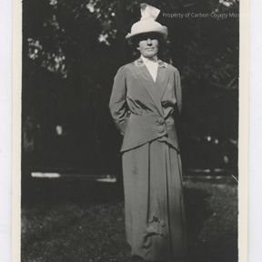 Black & white snapshot. Image shows a woman standing outside. She is wearing a two piece dress & a large white hat. There are trees and grass in the background.