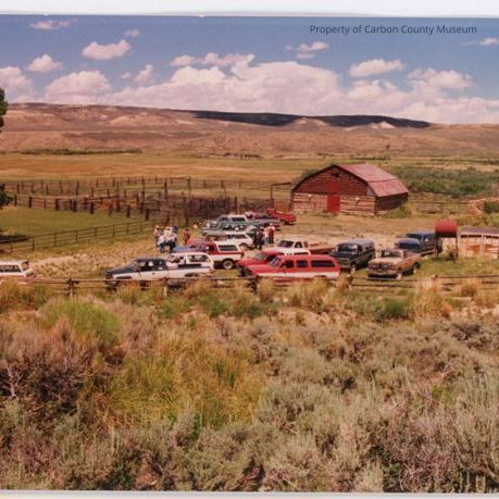 Update 2008: Color print. Snapshot. Image of a group of automobiles parked in a clearing on a ranch. A group of people are milling around the cars. Sagebrush in foreground. Rail fences around areas of ranch. Red roof barn and outbuildings near cars. Low hills in background.