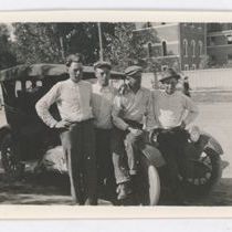 Black & white snapshot. Image shows a group of four men. Two are sitting on a vintage car & the other two are leaning against it. There is a woman walking on the other side of the street. There is a large building with a white fence around it in the background. There are also trees in the background.