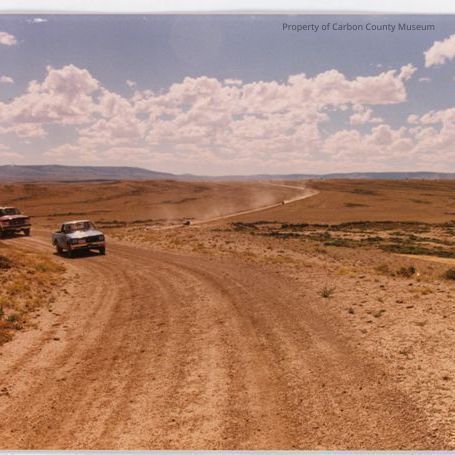 Written on the back in black ink: "July 28-90" "Following the overland emigrant trail neat the North Platte River Crossing-Saratoga and Elk Mountain Wyo. area [.] Caravan Stretching out from miles."