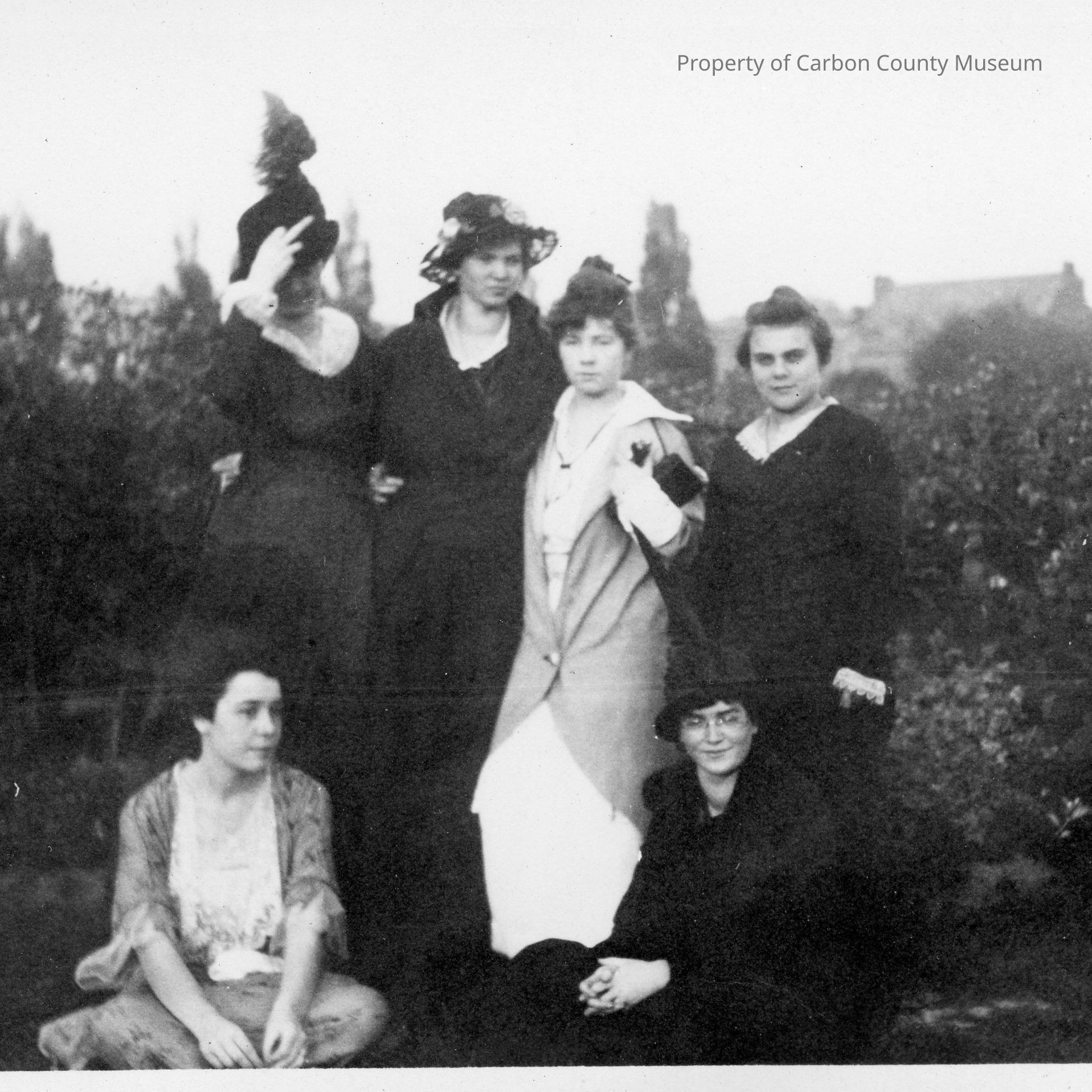 Black & white snapshot. Image shows a group of six girls. Two are sitting on the ground & the other four are standing behind them. They are all dressed up in dresses. Three of the girls are wearing large hats. There are bushes, tress & the tops of houses in the background.