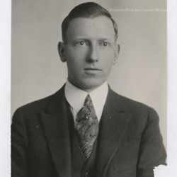 Studio portrait. Image shows a man dressed in a three piece suit. He is wearing multi-colored tie. His hair is combed back. Plain background.