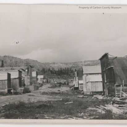 Update - 2009: Black & white print. Snapshot. Printed on postcard paper. Image of a small town set in a valley with forested hills in background. Wooden buildings line both sides of a dirt path overgrown with grass & weeds. Town appears deserted; pile of lumber strewn about in foreground at right.