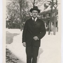 Black & white snapshot. Image shows a man standing outside on a sidewalk. He is wearing a dark suit & a hat. He has a ring on his left ring finger. There is a row of houses and telephone poles in the background. There is snow on the ground.