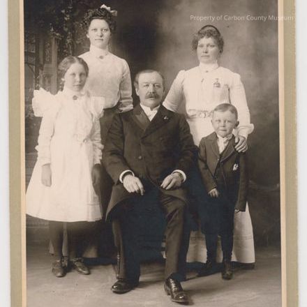 Update 2009: Black and white studio portrait of a family. There is a man seated. He is wearing a dark suit with satin looking inset on his right lapel, with a pin on his left lapel. He has on a white shirt with stand up collar and bow tie. His hair is medium colored and he has a mustache. His jacket tails are hanging over his thighs and he has dark lace up shoes. To his right side, there is a standing young lady dressed in a light colored dress, it has long sleeves, a round stand up collar with a ruffle cap over shoulder. She has a pin at her throat beneath collar. She has on dark socks and low top shoe with button closure. To the left of the man is a young boy dressed in a three piece suit and white shirt and tie. He has on tall lace up boots and dark leggings. Standing behind on left of picture is a lady with dark curly hair with a white bow on top. She is wearing a high stand up collar and light colored blouse and medium colored long skirt. Standing behind on right is lady wearing a light colored long dress. She has a watch pin on her left yoke with small chain going around her neck. There is a small pin on dress below her neck. She has her left hand resting on shoulder of small boy. Printed at bottom left in brown ink: " Brown" bottom right "Rawlins, Wyo".