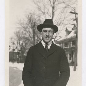 Black & white snapshot. Image shows a close up view of a man standing outside. He is wearing a three piece suit, tie & a hat. He has a ring on his left ring finger. There are houses, trees and telephone poles in the background. There is snow on the ground.
