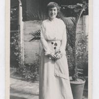 Black & white snapshot. Image shows a woman in a long white dress. She is holding flowers in her hands. There is a wooden fence behind her. There is a bunch of plants in the background.