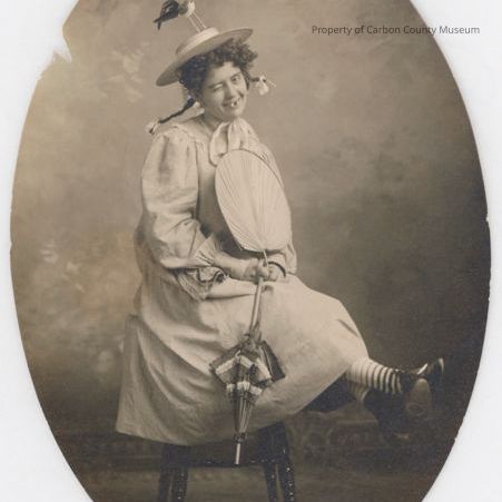 Update 6/2010: Black and white studio portrait of a young lady acting silly. She has on a straw hat with a long legged bird on top. her hair is in pigtails tied with ribbons. She is winking and has a blacked out tooth behind a big grin. She has on baggy dress, striped socks and holds a fan and parasol while sitting on a stool. Written on back in black ink: "Frances Smith Jungquist".