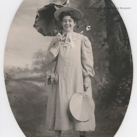 Update 6/2010: Black and white oval studio portrait of a standing young lady dressed silly. She is wearing a baggy dress and polka dot hanky hanging from the pocket, striped socks, straw hat with bird on top. Her hair is in braided pig tails with ribbons tied at ends. She holds a fan in her lowered left hand and an open parasol above her right shoulder with her right hand . A front tooth is blackened behind a big grin.