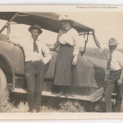 Update 6/2010: Black and white print of two men and one woman beside a vintage car. The woman has on a dark long skirt, long sleeve light colored blouse, dark socks and shoes. She has on a wide brimmed hat with decorative ribbon and bow on the crown. She is standing on the running board of the car. The men have on dark slacks and ties, light colored shirts and hats. Each man has his right arm stretched out and holding onto roof supports of car. Car has spoke wheels, canvas top and four doors. Written on back in pencil: "Do you know who they are! Ada."