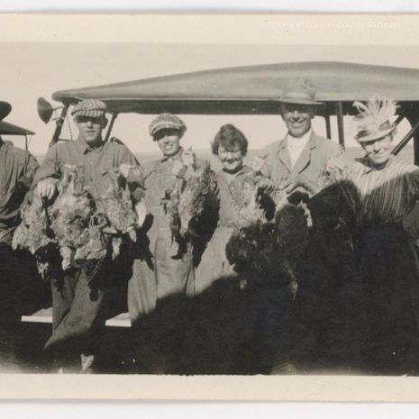 Update 6/2010: Black and white print of a group of six people holding game birds. Two on left are men, two in middle are women, then a man and woman. They are standing beside a vintage car with only top visible. A shadow of photographer is over right lower corner. Written on back in blue ink: "Two girls in the center are Jean Rumsey and Magie Doty-others unknown, holding sage chickens." "Given museum by Jean Schalk Sinclair, Wyo."