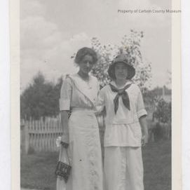 Black & white snapshot. Image shows two women standing next to each other in long white dresses. The lady on the right is wearing a hat & has her arm around the lady on the left. The lady on the left is holding a purse & a tissue in her hand. They are standing on a sidewalk. There is a white fence, grass & a tree in the background.