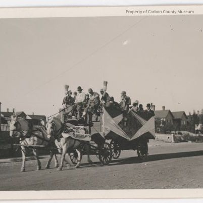 Update - 2009: Black & white print. Printed on postcard paper. Image of a group of people on a tall, decorated, horse-drawn wagon. Wagon is moving down a dirt street; houses in background. Brooms are being held upright at front corner of wagon. Unreadable sign on side of one horse. Part of a parade?