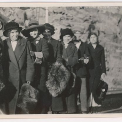 Update 6/2010: Black and white print of a line of people, six women and one man, standing second from right. Women have on heavy coats and hats and are carrying fur mufflers. there is a sheer rock bluff behind them. Written on back in black ink: "Ada Rivera, Veronica Clouse, Eileen O'Melia, Margaret Murray, Vincentia Clouse, Harry Phalen, Carmen Rivera."