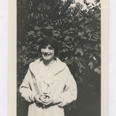 Black & white snapshot. Image shows a woman standing outside. She is holding an unidentified object. She is wearing a white jacket & has a white necklace around her neck. There are large bushes & trees in the background.