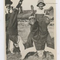 Black & white snapshot print of four women. All are wearing overalls. Two are being held upside down by their feet playfully. Looks like they are in a grassy field with lower hills in the distance.