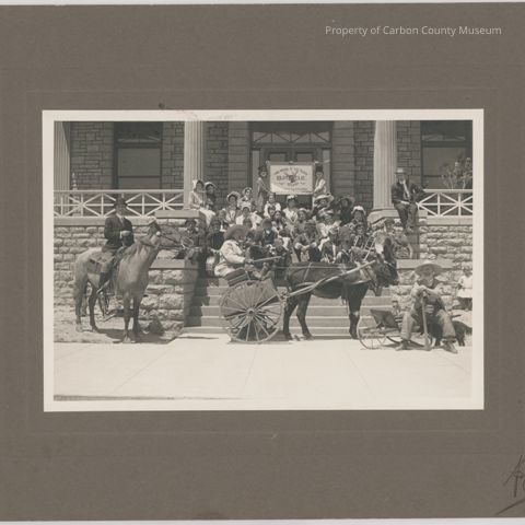 Written on back in black ink: "Elks Home Talent Show, Rawlins, Wyo." "Harry Brieterstein on horse. Mr. Hobbs in cart. Ora Wren on wheelbarrow. Director of play extreme right L.E. Startzell left. Tom Parks, Billy Edwards, -Brown, Mary Mahoney, Bunning; #1 Ada Rivera, May Burns, Ella Daley, Florence Buchanan, Esther Clause, Rachel Chapman, Edith Bennett, #2 Carmen Rivera, Helen McMicken, Alice Laskey, Nora Mahoney, Leta Alcorn. Sign carriers: Pat OMelia."
