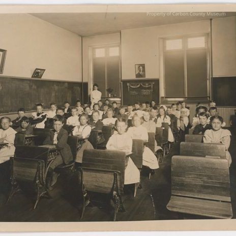 Update 6/2010: Black and white print of a fourth grade class room. Four rows of desks with approximately 40 students. They are all seated in wood desks with metal legs and desk sides. A teacher stands in the back of the class room. A black board is on photo right. Ceiling is high and 2 large windows with shades are on back wall. Students have their arms folded on desk tops. Written on back in blue ink: "Fourth Grade 1907-08".