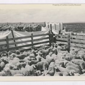Black & white snapshot. Image shows a herd of sheep in the corner of a pen & cattle in another pen. There are white tarps surrounding the cattle pen.