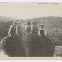 Black & white snapshot print of six people in overalls sitting on a large rock. Four of them are wearing hats. Brush & grass cover the ground. There are several rolling hills in the background.