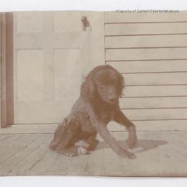 Black & white snapshot. Image shows a small, long haired black dog sitting on a porch. His right paw is raised & curled. The house wall & front door are in the background. The house & porch are white.