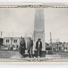 View 1. Image shows two women in dresses & jackets. Jackets are heavy with fur around the collar & each is wearing a hat. There is a man in the middle wearing a suit & hat. All three are sitting next to the Pioneer Monument. Written on the concrete marker "Erected on the site of the Oregon Trail in memory of the pioneers who blazed the way Built by Natrona County pioneer Association 1849-1911" Trees, buildings & telephone poles are in the background.