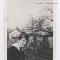 Black & white snapshot. Image shows a woman sitting. She has her hair up. There is a fence, houses & trees in the background.