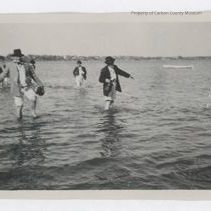 Black & white snapshot. Image shows a group of five men standing in a large body of water. All are wearing hats & suits with their pants rolled up. A canoe is in the background.