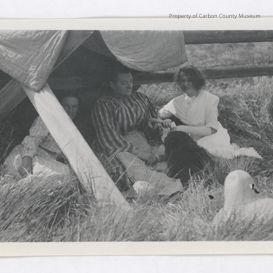 Black & white snapshot. Image shows a group of thee women sitting outside. All three are wearing long dresses. They are sitting on the ground with a blanket propped over their heads like a tent. There are two hats in front of them & corral poles behind them.
