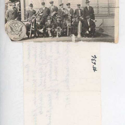 Update 2009: Black and white print of a group of men holding band instruments. Some standing, some kneeling. Large drum on photo has American Band written on it. Taken in front of a building that has horizontal bars. Another small group of people in photo left All men are wearing hats, some western, some driving caps, one conductor hat . Attached to print with clear tape is paper on which is written: "Hanna Band. Standing L to R Sam Dickinson, Wm. Warburton, J. Choate, Jim Fasinelli, H. Sherrat, J. Sherrat, Wm. Mellekis, Joe Woods. Kneeling l to R Evor Jones, H. Brindley, S I Rodda, B. Tavelli, Geo Wilks, J R. Mann, J. Lee. in front of old Co Store 1918."