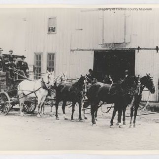 Black & white print. Image shows five men in a stage coach. There are six horses, four dark color & two white. They are hooked up to the stage coach. There are five other men standing around a horse carriage in the background. All men are wearing suits & hats. There is a two-story building with three windows in the background. There are two boys with their heads showing in the top window.