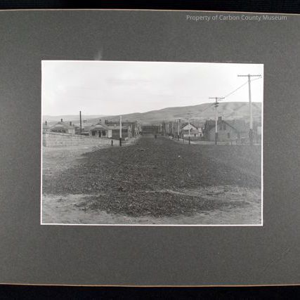 Black & white print on black mat. Image shows a gravel road. In the middle of the road is a man on a horse. On both sides of the road are houses & buildings. On the right side is a row of telephone poles with white tops. On the left side is a stone wall. There are hills in the background. The building in the far distance is the Rawlins Train Depot. Engraved on lower right corner: ""The Ferris Studio Rawlins, Wyo"
