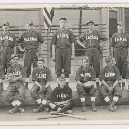 Update 2009: Black and white postcard of group of twelve men, dressed in baseball uniforms. The uniforms are dark colored with "HANNA" across shirt front in white. Three men on photo left are seated on log. Six men are standing behind the log. There are two bats laying on ground in front. Men are standing in front of building with horizontal bars on windows. All men are wearing baseball caps. In lower right corner is embossed "F.T. Nakaco Hanna, Wyo".