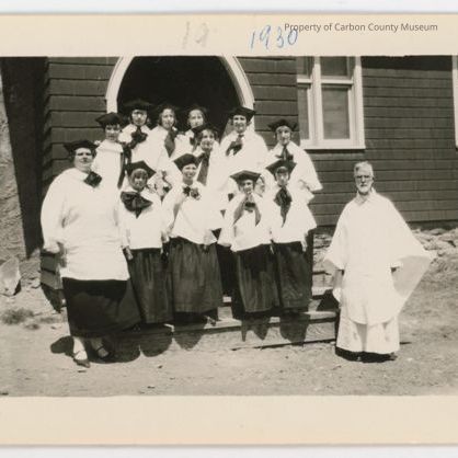 Written on back in black ink: " R L R Mrs.. S. L. Morgan, ?, Ruth Milliken, Beth Lee, Freda Pickup, Father Bacon. Middle row L to R Jean Briggs, Marion Milliken. Back row L to R Agnes Amass, Elvira Edlund, Leona Mangan, Sadie Lee, Irene Lucas. Episcopal Church St. Marks Hanna, Wyo" "Year 1930" "Father Bacon".