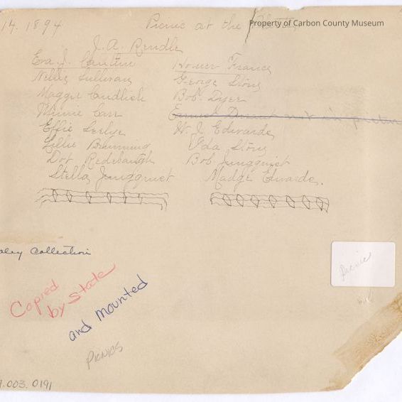 5. One 5 x 7 black & white copy print made from original print #1. Names, date & "Picnic at the Platte" written on back in blue ink. Stamped on back in black: "Copy Provided by the Wyoming State Archives and Historical Department"