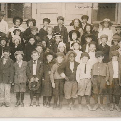 Black & white print card of approximately forty boys & girls. They are standing on the steps of an entryway with wood double doors. The sides are clapboard & there is mesh over windows on both sides of the door. Most of the boys in the front row are wearing knee pants with leggings & lace up shoes. The boys & girls are wearing hats except one boy in the front row, who is holding one in his hands. There is a black boy 5th from right in the front row.