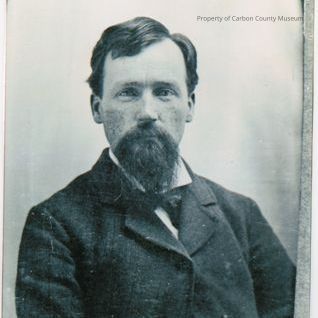 Black & white copy of a studio portrait. Image of a man with dark hair parted on his left, a mustache & beard on chin. He is wearing a dark textured suit coat with top buttoned, light colored shirt & dark bow tie. Top has dark corners that have copied from oval print on mat, right side is irregular border copied.