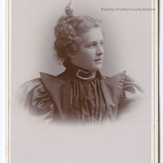 Update February 2011: Black & white studio portrait. Image of a woman with a dark silky, pleated top, pouffy sleeve dress. Two triangle shape pieces of fabric are at shoulders, a brooch is on a high collar. Her hair is in a curly updo with a decorative piece on the back of her head. In script on bottom: "Cornwell 295 & 297 Jefferson Street, Buffalo"