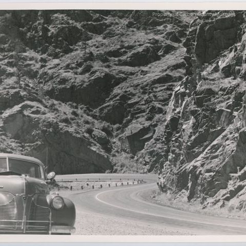 Update 6/2010: Black and white print of a road curving along side of a sheer rock and a steep mountain. on photo left a vintage car is setting on gravel beside the road. The grill of the car is shown and "Pontiac" is written on the hood. A partial license plate number and year "98" and "41". Written on back in blue ink: "Snowy Range Geo. Abbott."