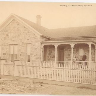 Black & white scanned print of a stone house. House has a covered porch with five decorative posts & a decorative railing around the bottom. A small child sits on the railing & two women stand behind. One woman is wearing a checkered long dress & the other a long dark dress. A picket fence surrounds the house with a gate in front. A walk leads to three porch steps. Two brick chimneys are on the roof.