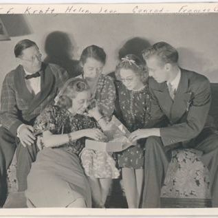 Black & white print of a family group. There are two men & three women sitting on a floral covered sofa. The center front woman is holding an open box. A thin paper is protruding from the box & the woman holding box is reaching into the box for what appears to be a cookie. The man on right is also reaching toward the box. The man on the left has his right hand on his left knee & is looking toward his family. The two women in the middle behind woman with box are looking at the box. The men are wearing suits & the women are in nice dresses or a skirt & blouse. A thin pole lamp with small shade is on photo left. Their shadows are cast on the wall behind them.