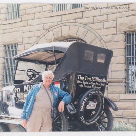 Update 2009: Color print. Snapshot. Image of an older man posed with a vintage Ford automobile in front of a multi-story stone building with barred windows. man is dressed in a tan jumpsuit and blue jacket; he has a camera bag? over his shoulder. Man is standing with his left arm resting on the back fender of the car. Car is painted with: " the Ten Millionth New York to San Francisco Via Lincoln Highway". On the spare tire cover: "Diamond 1924 Ford 1999 Anniversary. N.Y. to San Francisco. " Car has a canvas fold down roof.